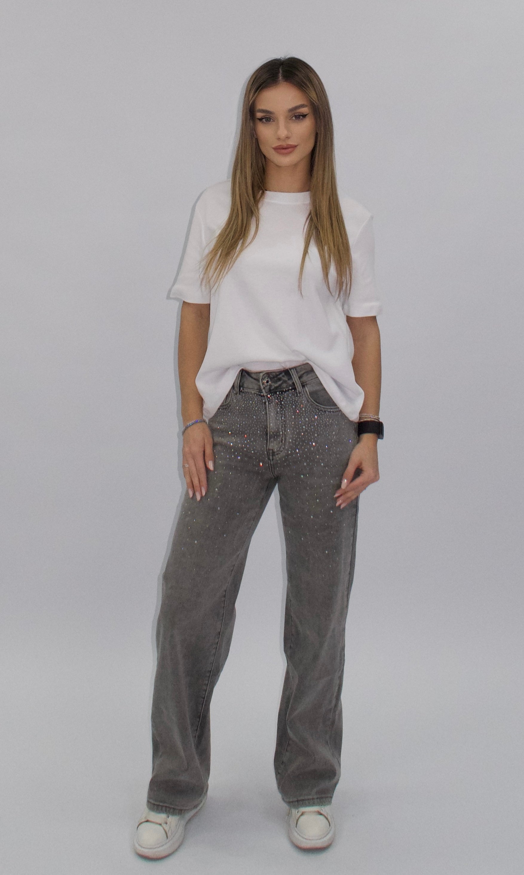 Blugi gri, lejeri, cu talie înaltă și detalii fine de strass aplicate în partea superioară. Perfecți pentru un look casual cu accente glam, potriviți atât ziua, cât și seara.