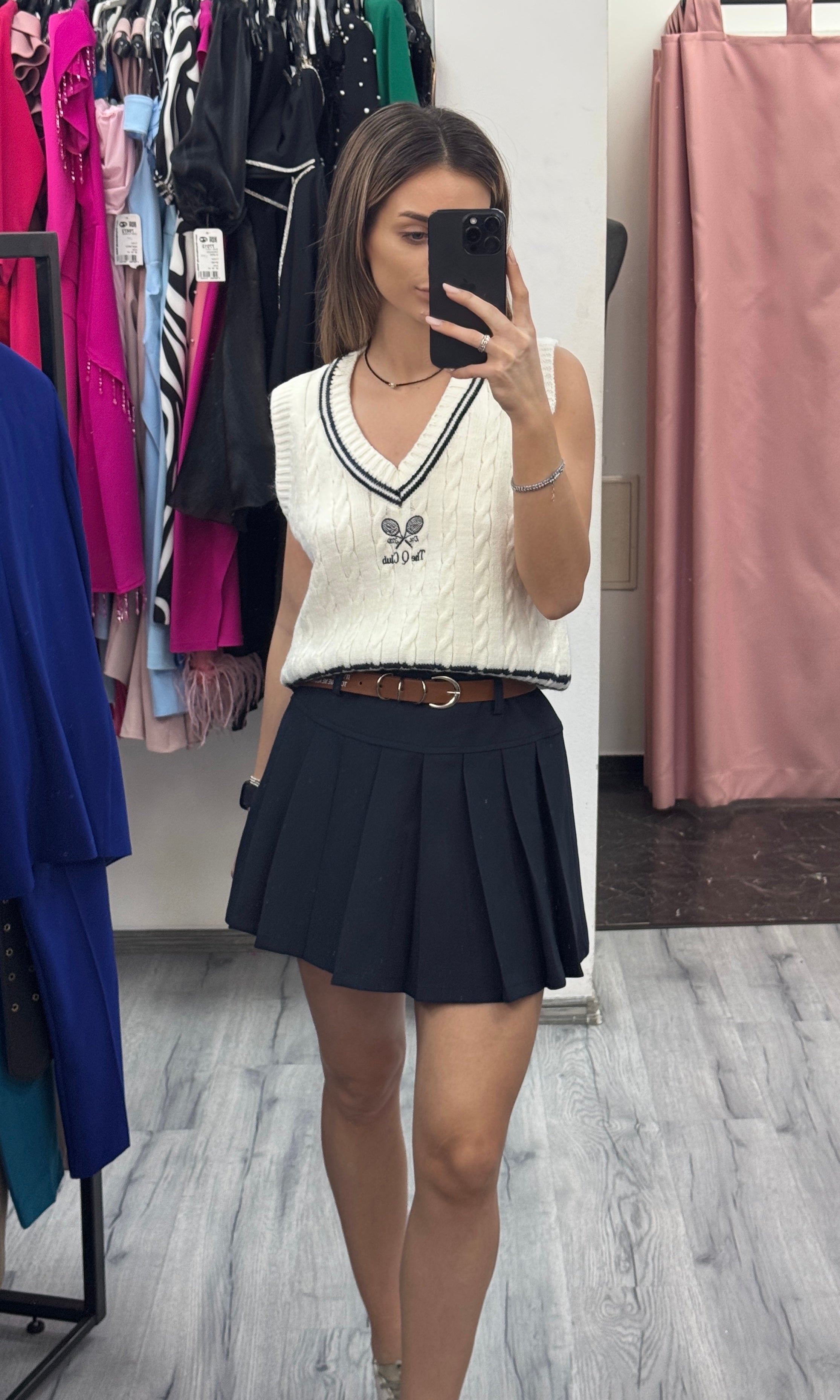 Fustă mini plisată bleumarin, inspirată din moda sport-chic a tenisului. Cu o croială în formă de A și talie medie accesorizată cu curea, această piesă oferă un look fresh și feminin. Ideală pentru ținute casual, preppy sau street style, poate fi combinată perfect cu veste tricotate, cămăși sau topuri simple pentru un efect wow.
