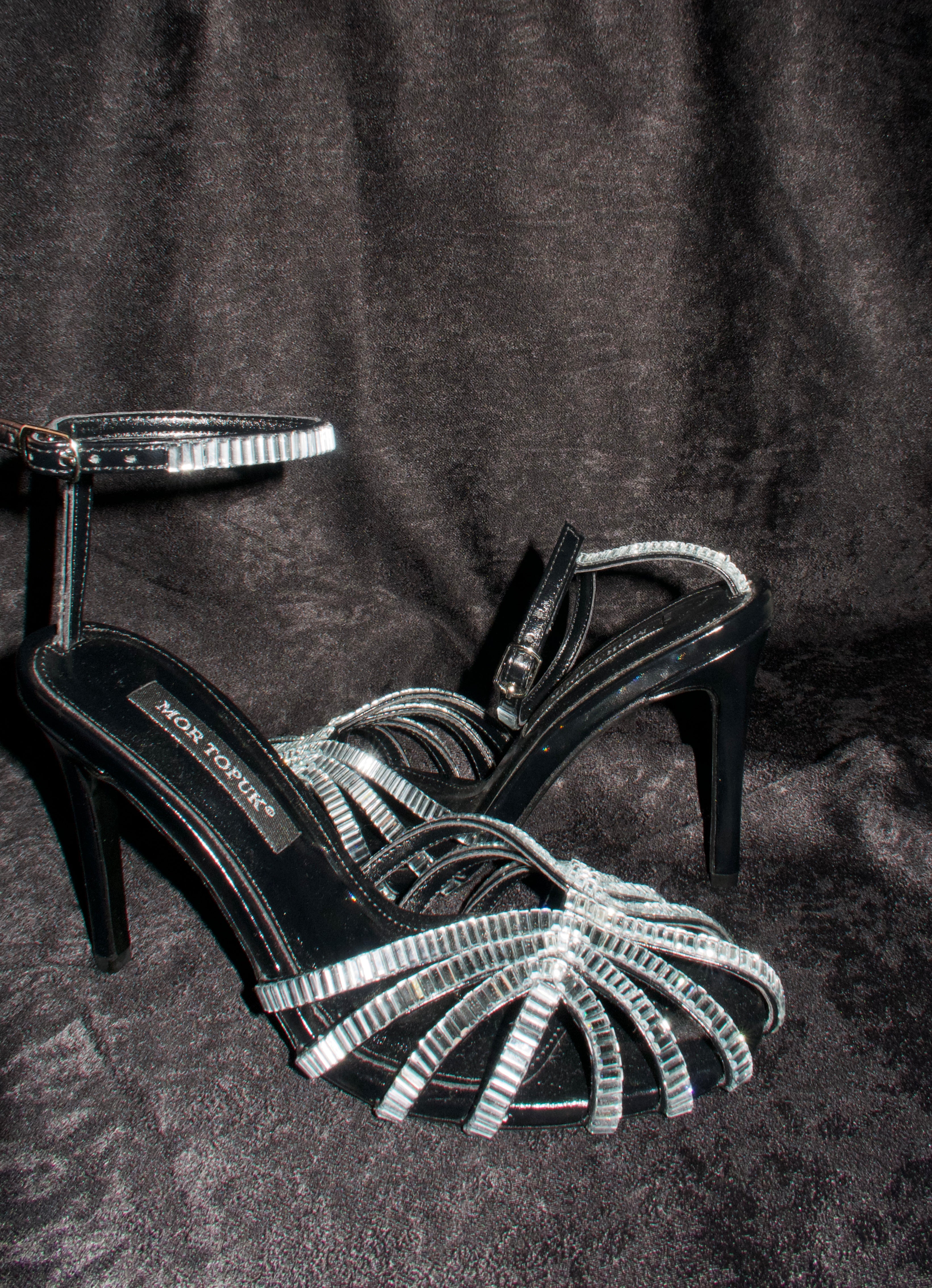 Sandale negre cu design sofisticat și barete multiple decorate cu cristale
