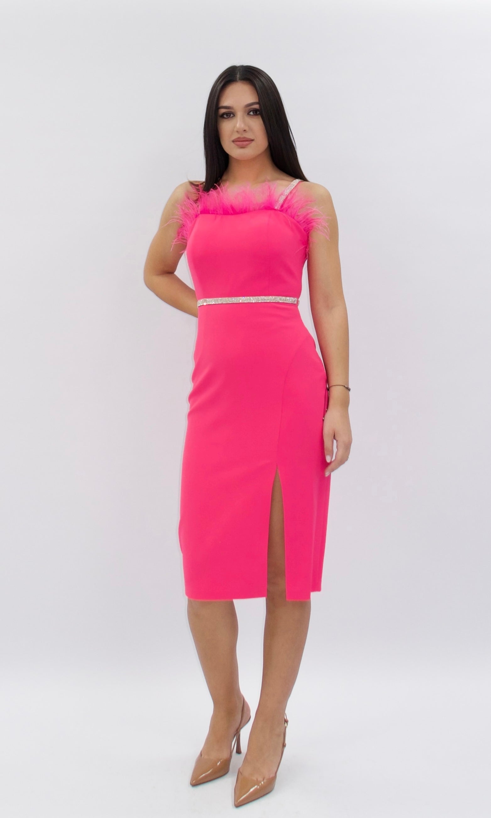 Rochie midi roz cu pene și detalii strălucitoare – Eleganță și feminitate pentru evenimente speciale. Fii în centrul atenției cu această rochie midi roz vibrant, decorată cu pene delicate și detalii strălucitoare. Cu o croială elegantă, bretele fine și un slit senzual, această rochie este alegerea perfectă pentru petreceri, nunți sau evenimente speciale. Comandă acum și adaugă un plus de rafinament garderobei tale!