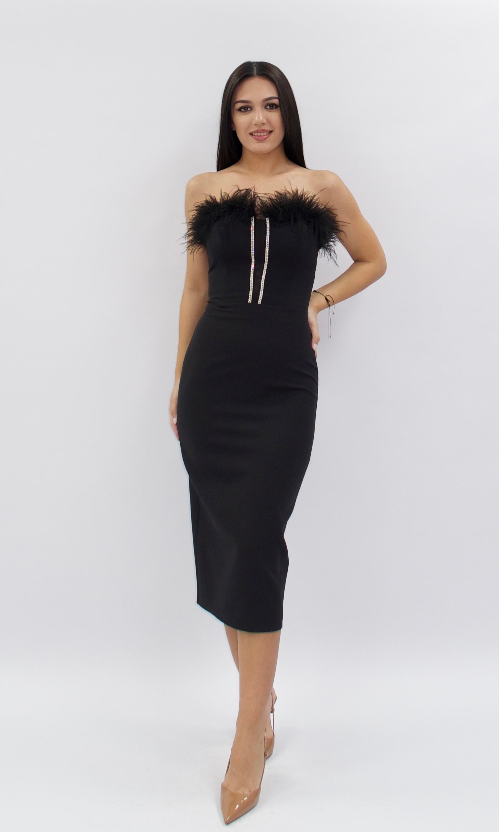 Rochie midi de damă, elegantă și rafinată, confecționată din material negru de calitate, fără bretele, cu detalii luxuriante din pene și accesoriu strălucitor pe bust. Croiala feminină și lungimea midi subliniază silueta, fiind perfectă pentru evenimente de gală, petreceri sau cocktailuri. O alegere spectaculoasă pentru un look memorabil.