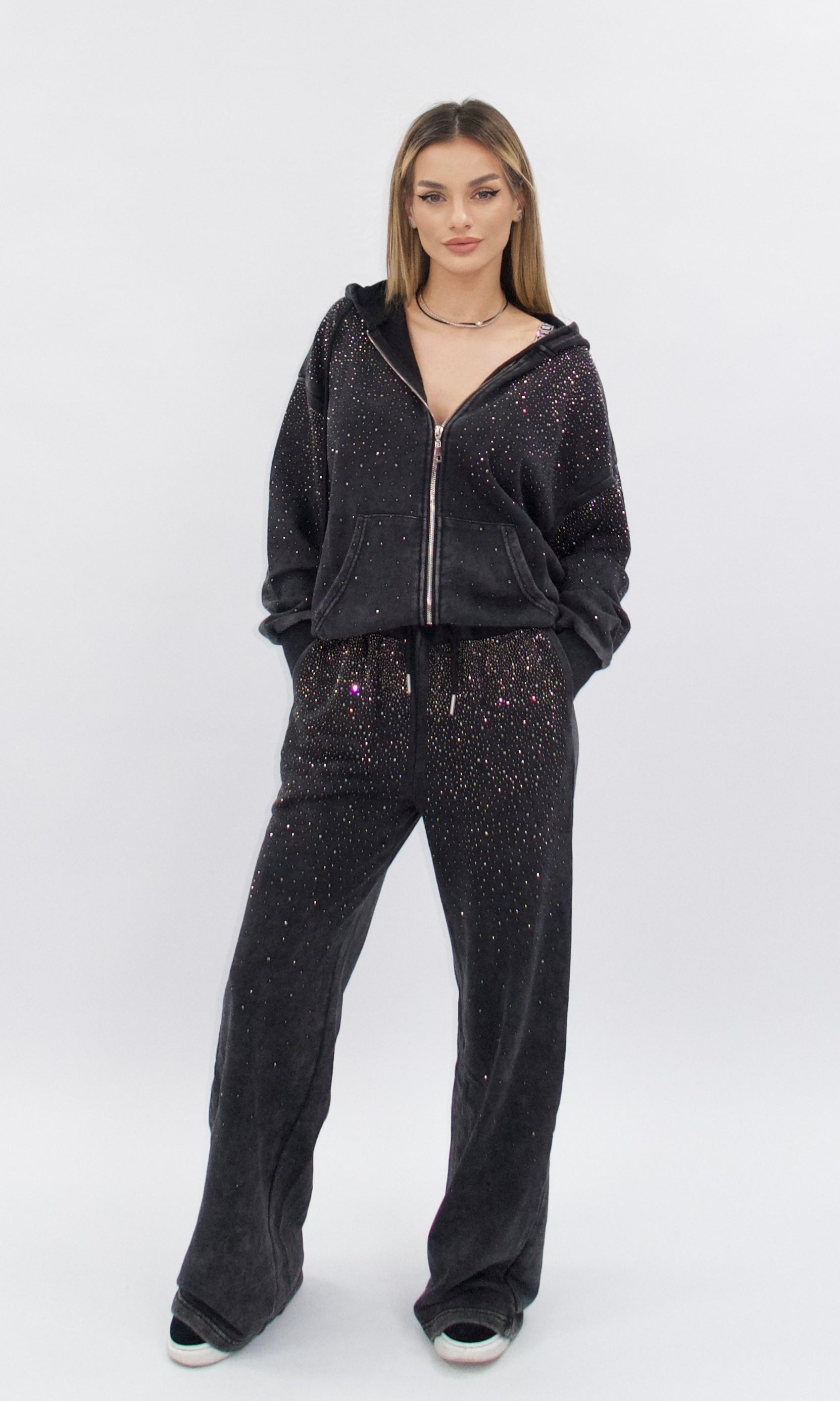 Trening negru, decorat cu strasuri fine, format din hanorac cu fermoar și pantaloni lejeri. Confortabil și stylish, ideal pentru ținute casual cu strălucire discretă.