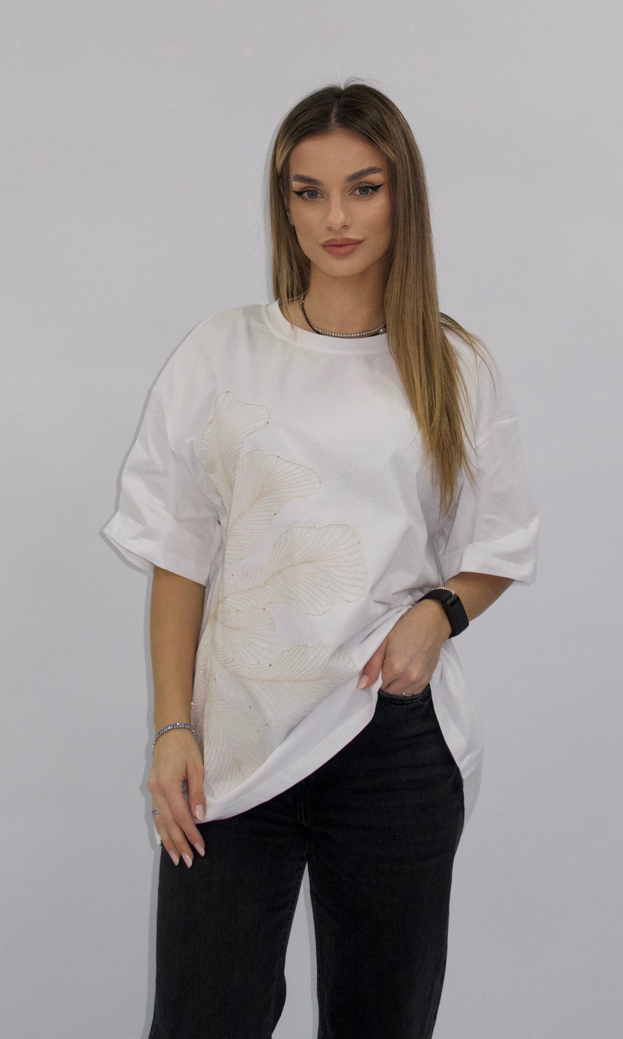 Tricou alb, croială lejeră, decorat cu broderie fină în formă de flori. Perfect pentru un look delicat, feminin și ușor de asortat.