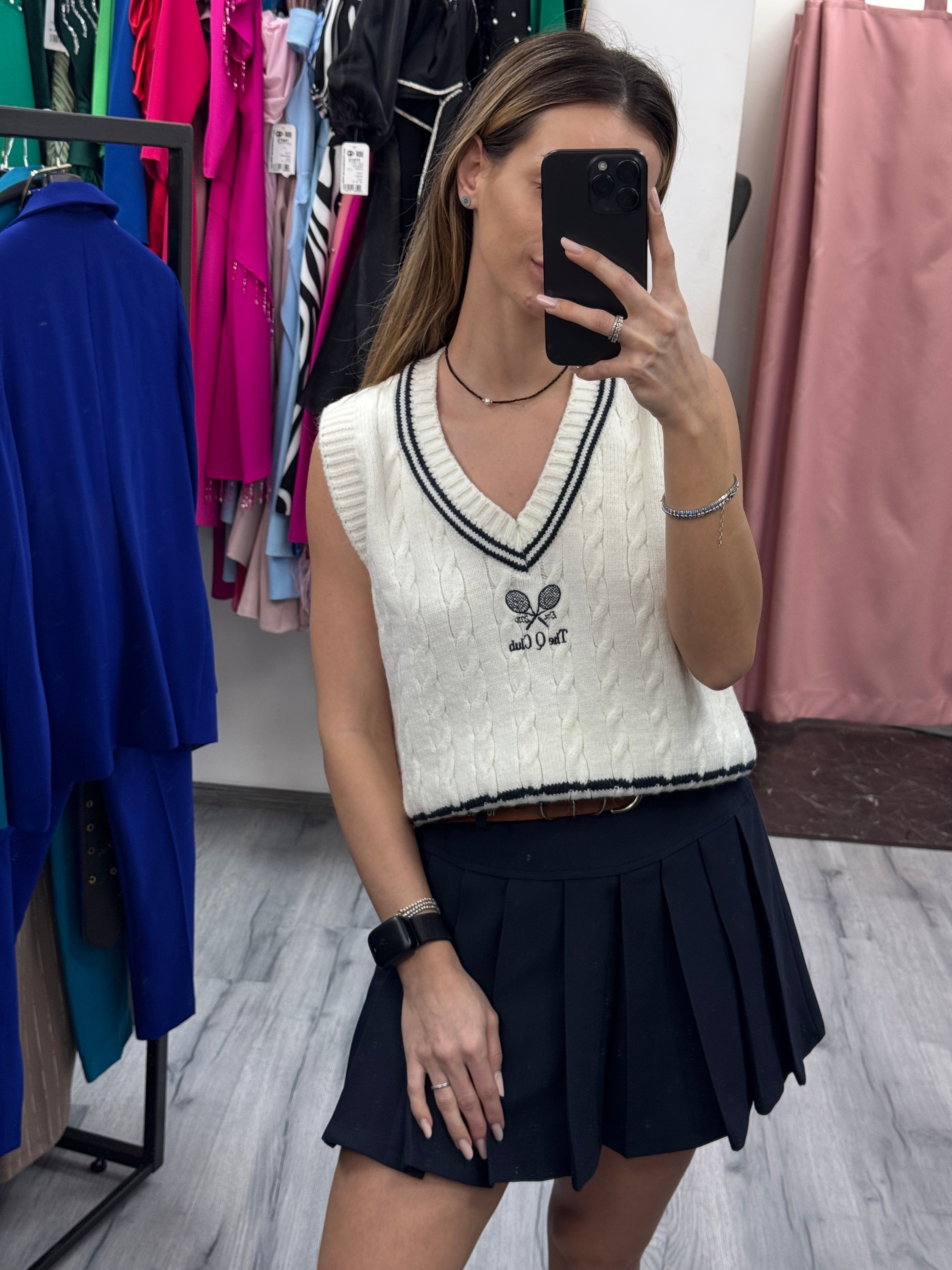 Adoptă un look preppy și stylish cu această vestă albă tricotată, inspirată din moda de tenis. Model fără mâneci, cu decolteu în V și detalii contrastante bleumarin, ideală pentru ținute casual-chic. Logo „The Q Club” brodat pe față. Asorteaz-o cu o fustă plisată pentru un outfit sport-casual perfect!